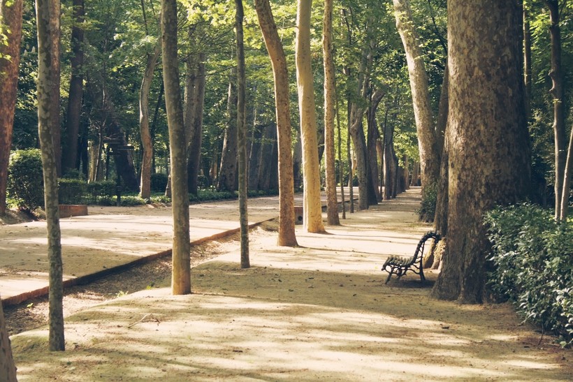 Если вы любите гулять по огромным благоустроенным паркам и едете по Испании в этом регионе, в Аранхуэс заворачивайте обязательно. Здешний парк именно таков. Он очень велик или показался мне таковым, по-моему, мы не прошли его полностью, только какую-то часть, потому что время заканчивалось и нужно было ехать дальше. По нему удобно ходить, даже если вы девушка и совершенно случайно отправились в путешествие на каблуках: дорожки здесь ухоженные, ноги не переломаете. Но в удобной обуви, конечно же, лучше. И в закрытой: на дорожках много мелких камешков, а еще поднимается пыль, которая оседает на обуви и ногах почти незаметным ровным белесым слоем. Обнаруживаешь это, когда мазнешь по ноге чем-нибудь темным, или рукой прикоснешься, а потом проведешь пальцами по черной футболке. В общем, модники, будьте бдительны.