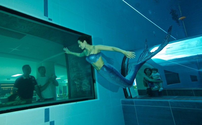 И весь этот объем используется грамотно, архитектура подводной части очень интересная. Дизайнер и архитектор постарались на совесть. В бассейне есть несколько уровней с глубиной 10, 15 метров, и 40-метровой шахтой. Множество гротов, арок и ниш, а также очень реалистично выполненная пещера. На пятиметровой глубине бассейн пронизывает стеклянный тоннель, по которому неныряющие посетители могут пройти на другую сторону бассейна, а по всему периметру на разной глубине есть смотровые окошки.