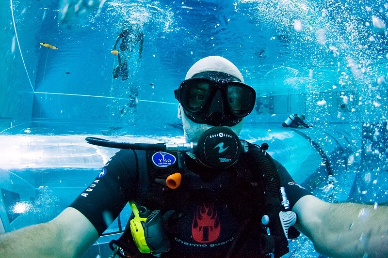 Про бассейн: Y-40 открыл для посетителей свои гостеприимные двери в мае 2014 года. Нам посчастливилось стать первыми дайверами из России, совершившими погружение в этом удивительном месте. Место постройки бассейна было выбрано не случайно – считается, что в этом регионе Италии проживает больше всего дайверов. Сюда просто и быстро можно доехать из многих стран Европы. Кроме того, Монтегротто – один из крупнейших термальных курортов. Поэтому наполнен бассейн не простой водой, а из термальных источников; вода эта, по рассказам, обладает омолаживающим и оздоровительным эффектом. По этой же причине воду не подогревают, ее естественная температура 34-35 градусов. То есть нырять можно в плавках, без гидрокостюма. Воду также не хлорируют, а очищают при помощи мощной системы фильтров.