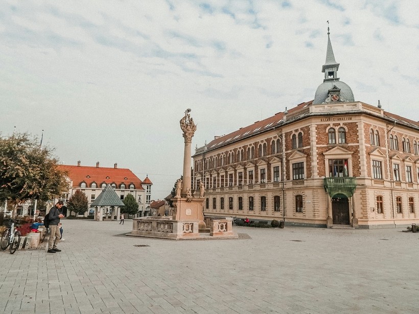 После осмотра замка возвращаюсь на уже знакомую мне улицу Кошута, на этот раз иду в противоположную сторону. Она приводит меня на площадь Фё, где возвышается величественная францисканская церковь, памятник Святой Троице и здание гимназии.