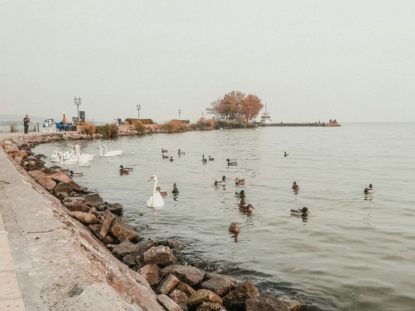 Сев на поезд (на мой взгляд, самый бюджетный вариант путешествия из Будапешта на Балатон), я удобно устроилась у окошка, высматривая, когда же передо мной покажется море-лужа. Прошло немногим меньше часа, и вот маленькие жилые домики сменяются прозрачно-голубой гладью воды. Балатон действительно похож на море: озеро простирается далеко за линию горизонта и кажется бескрайним. К сожалению, фотографий из поезда у меня нет, но на снимках набережной ниже вы это обязательно увидите.