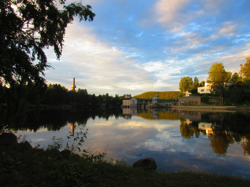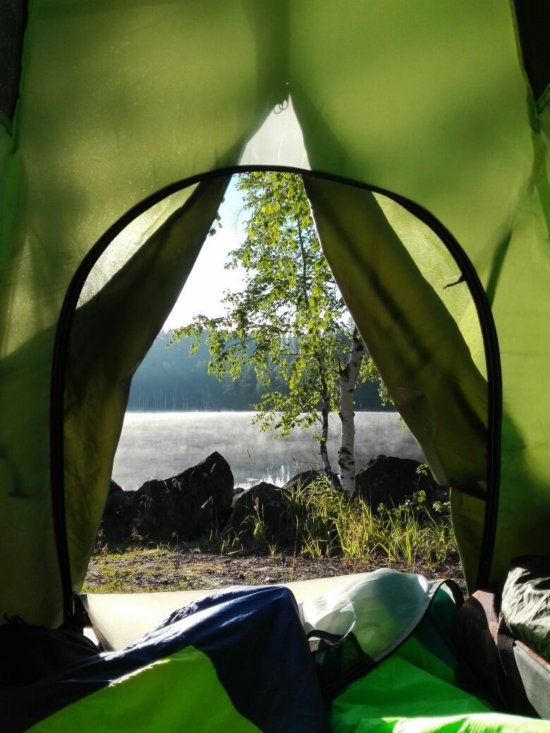 Смеркалось, мы перешли мост через озеро и решили искать место под палатку и тут нас ждало глубокое разочарование, леса по обе стороны болотистые и полны огромными валунами. После долгого дня с рюкзаком на плечах, навалилась жуткая усталость и мы неготовы были всю ночь провести на трассе. И тут мы дошли до очень длинного моста через озеро. Было уже за полночь, поэтому у нас не было желания тратить время на долгие хождения, свернули перед мостом в маленький дачный поселок. Разбудили всех собак в округе, поэтому ускорили шаг и вскоре нашли безлюдное место, сначала прочесали лес в поисках хорошего места, но там не было и метра ровной поверхности. В отчаянии мы просто поставили палатку на берегу озера, в метре от проселочной дороги, благо ночью по ней никто не ездил. Рано утром нас разбудил автомобиль с грохотом проехавшийся мимо нашего ночлега, зато вид из палатки был сказочный.