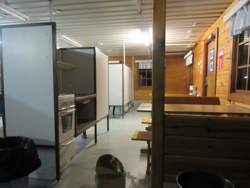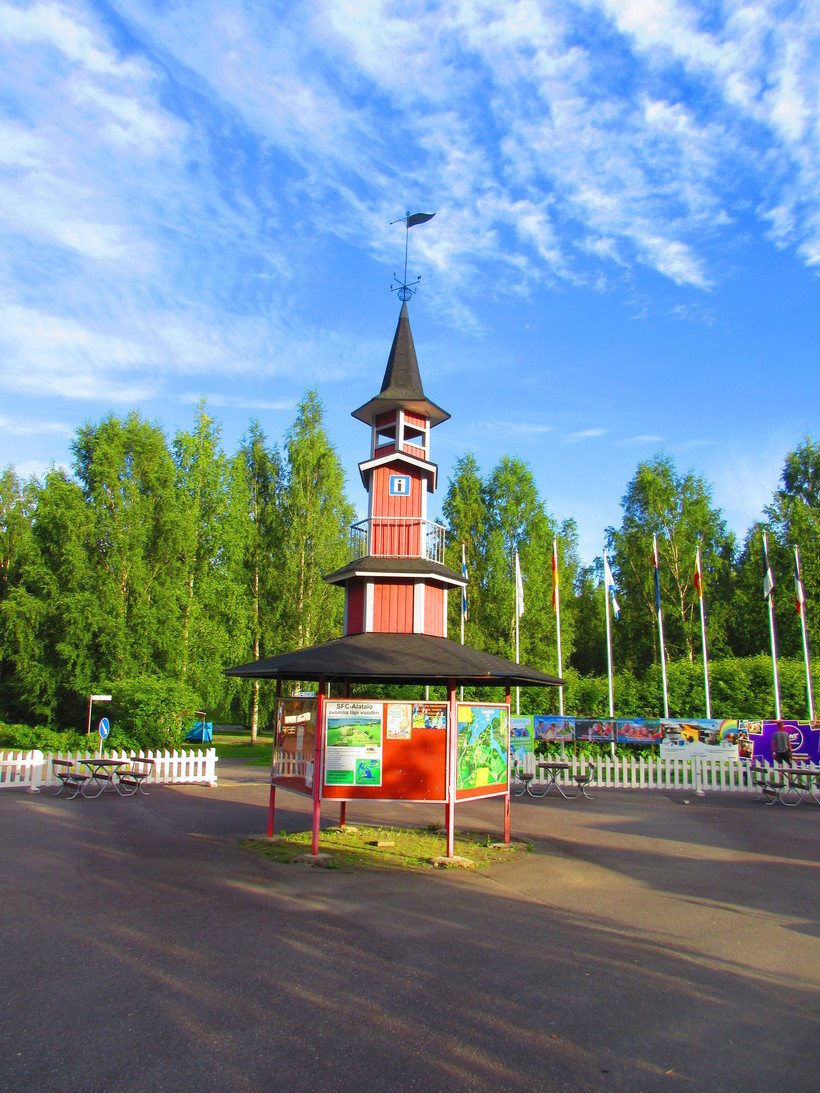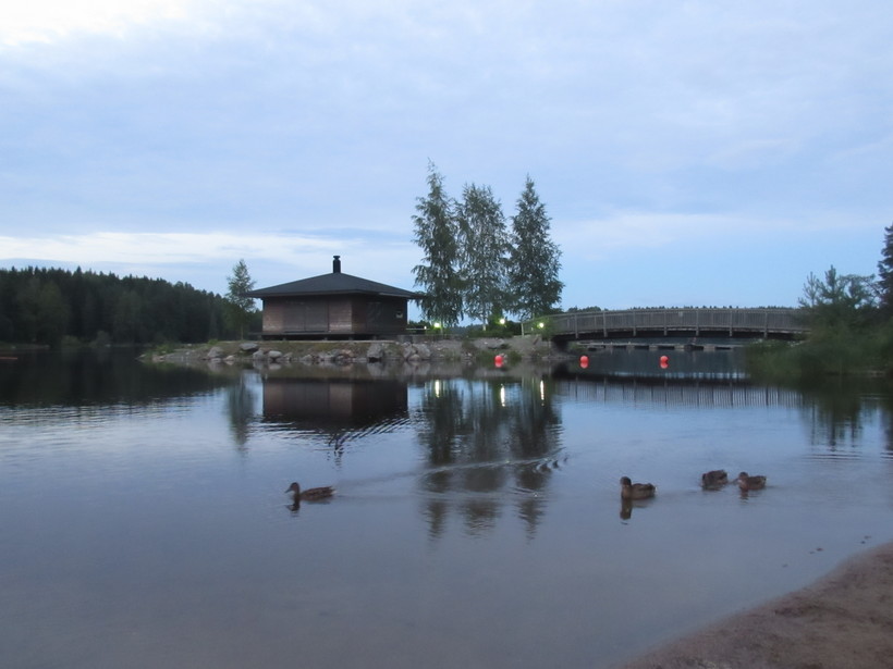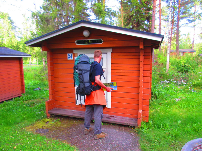 Весь день ушел на автостоп и только к вечеру добрались до пригорода Куопио. Мы решили не ехать в город, потому что в нем не было дешевого жилья, а заселиться в кемпинг, до которого было рукой подать. Цены в кемпинге не сказать, что дешевые (место под палатку - 20 евро, мини-домик на двоих - 38 евро). Зато сам кемпинг обладает внушительными размерами, включает в себя парк, лесную зону, озеро и приличные душевые и туалеты. Это наверное лучший кемпинг, который я видел. Разнообразие гостевых домов впечатляет (от огромных вилл до крошечных лачуг), решили взять домик (скорее будку), чтобы разнообразить наши ночевки. Две кровати, тумба, две полки, лампочка и две розетки - вот и вся скудная обстановка.