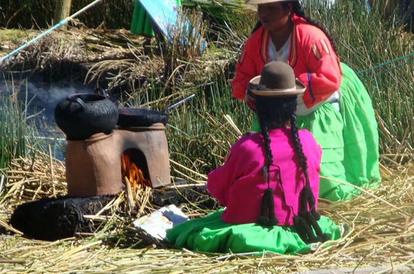 Жизнь у племен очень интересная. У каждого домика-хижины есть солнечная батарея и прикольная кладовая. Еду готовят на огне, который разводят на камнях. Главное занятие, конечно же, рыболовство. Удивительно, что у них есть утки и гуси, а также они сажают картошку. Еще нам рассказали, как строятся такие острова, и пригласили покататься лодке из тростника.