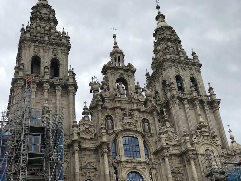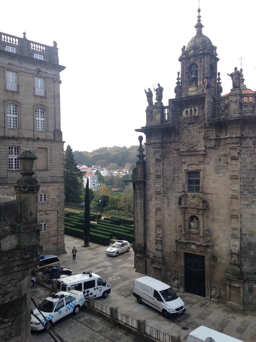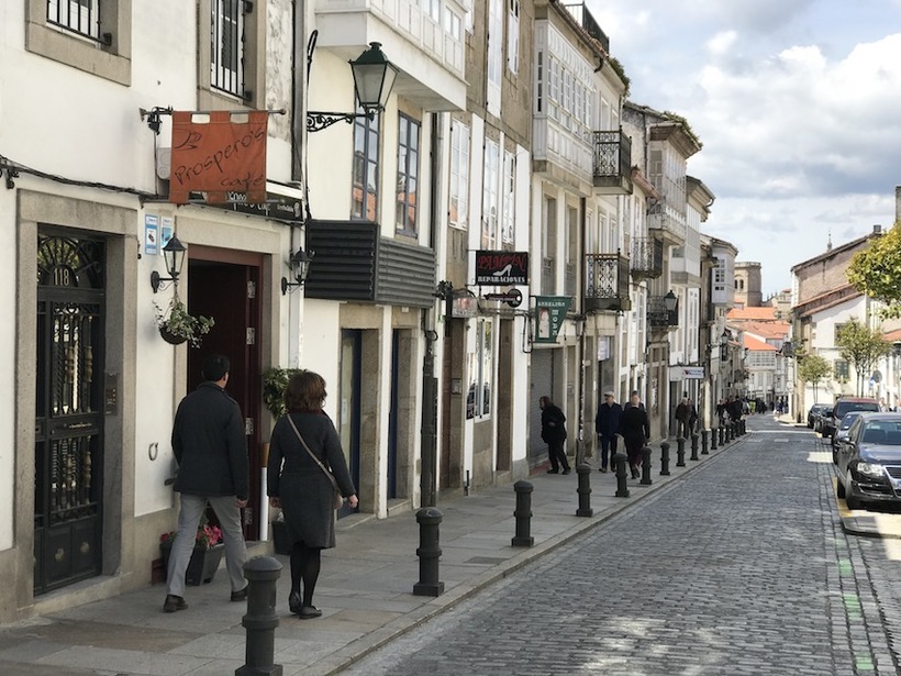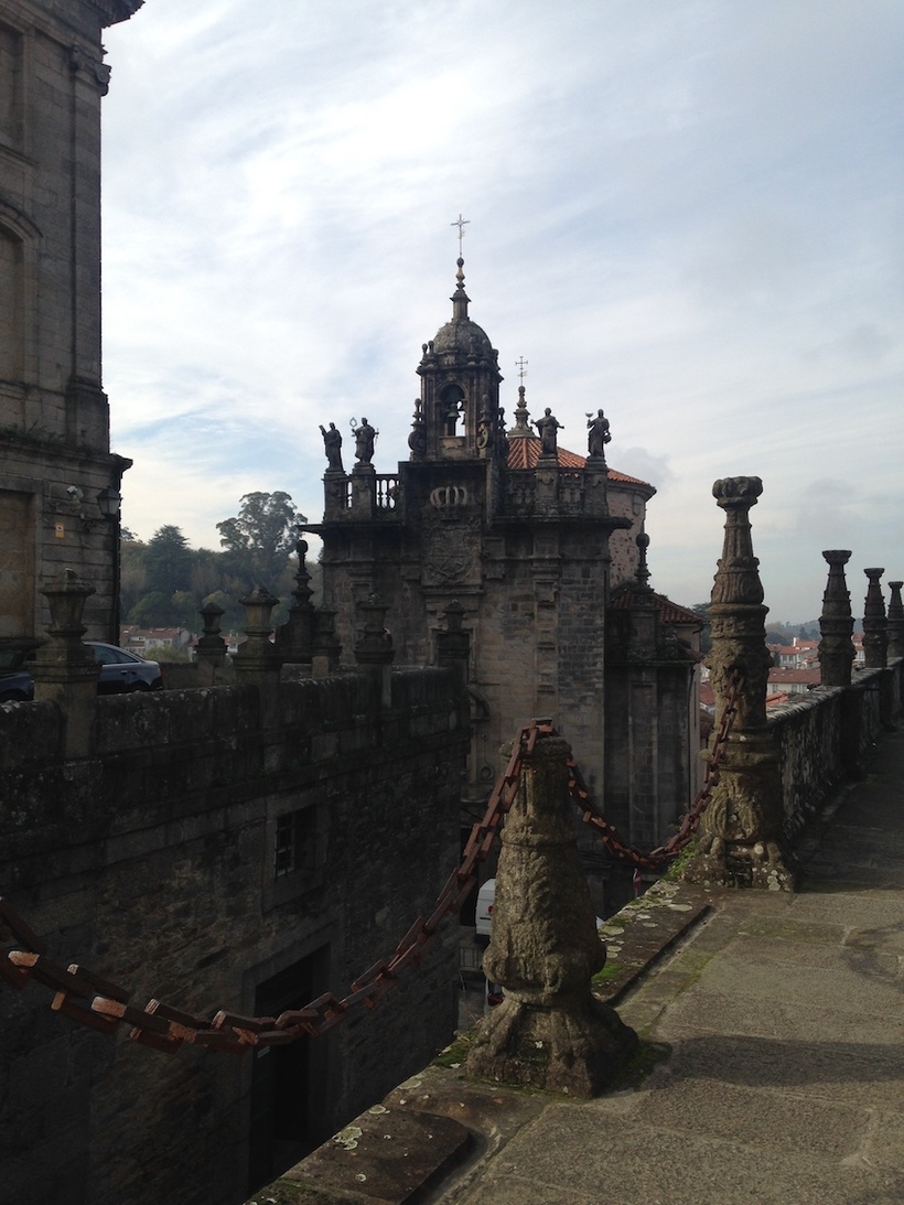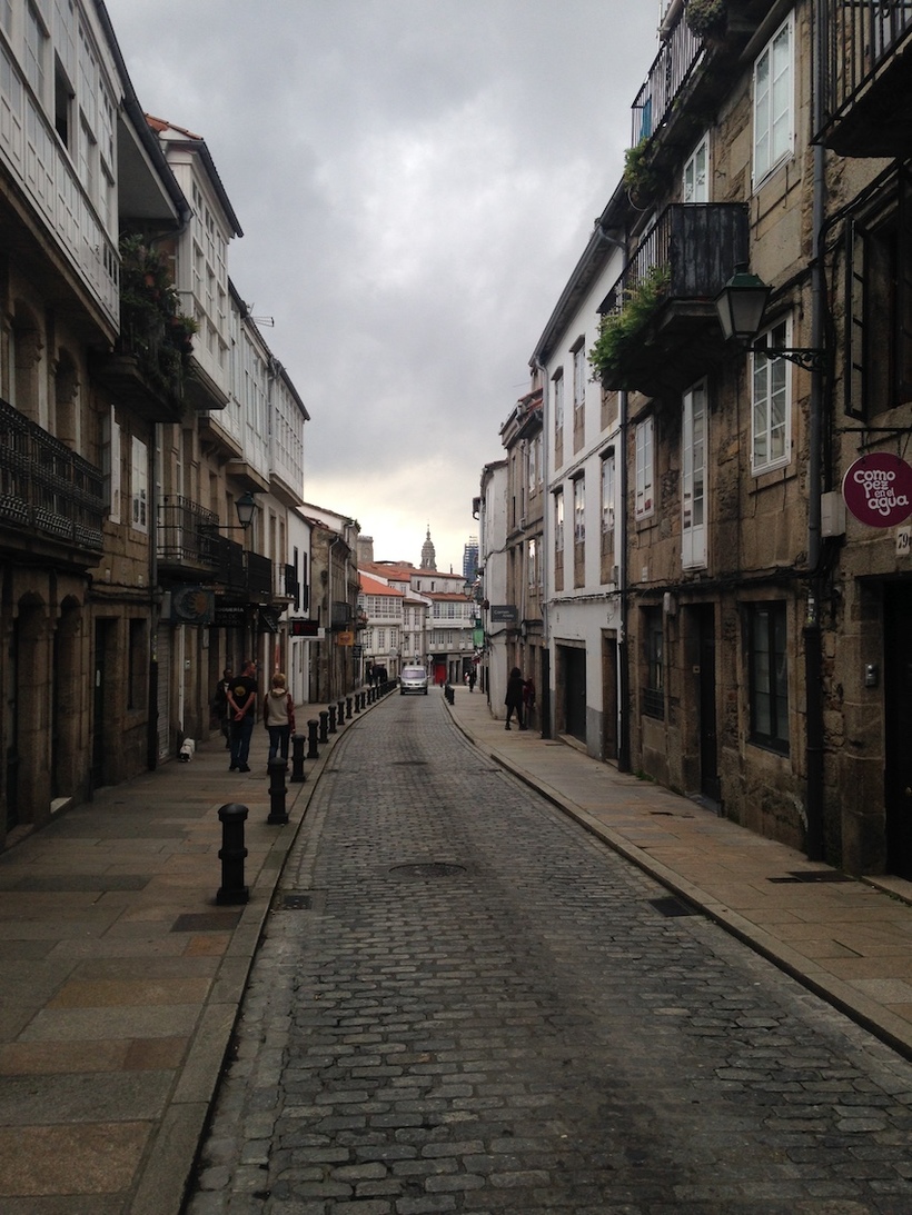 Сантьяго де Компостела - средневековый. Узкие улочки, мощеные дорожки, дома из камня. Немного серый, потому что очень древний. Стены построек во мху. От сырости - близко океан, и холода - север все-таки. Такая атмосфера придает городу особый воздух.