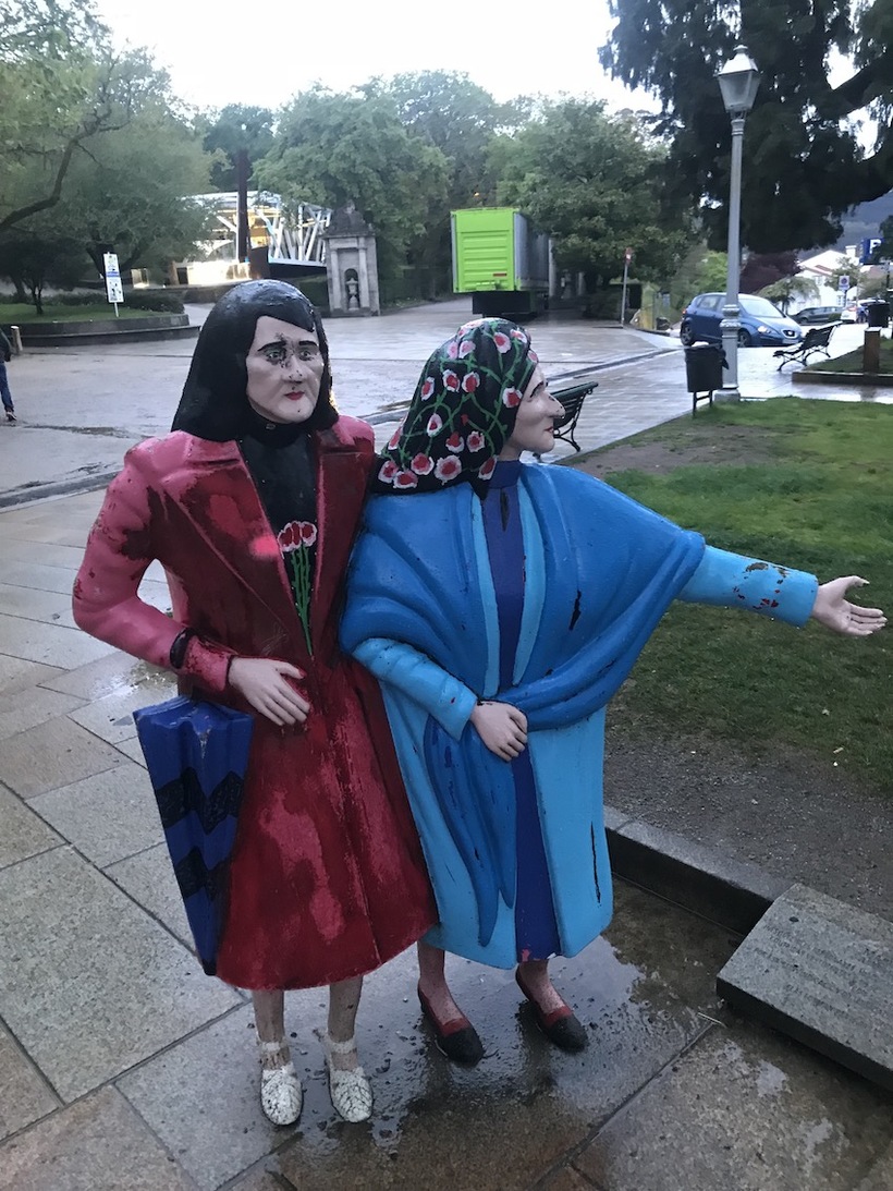 - Улыбнуться памятнику смешных тетушек в парке Аламеда. Местные говорят, что дамочки - реальные жительницы города середины двадцатого века. Две сестры. Сантьяго периодически перекрашивает их платья в другие цвета. Раньше старушки в красном были, нынче одна в голубой наряд переоделась.