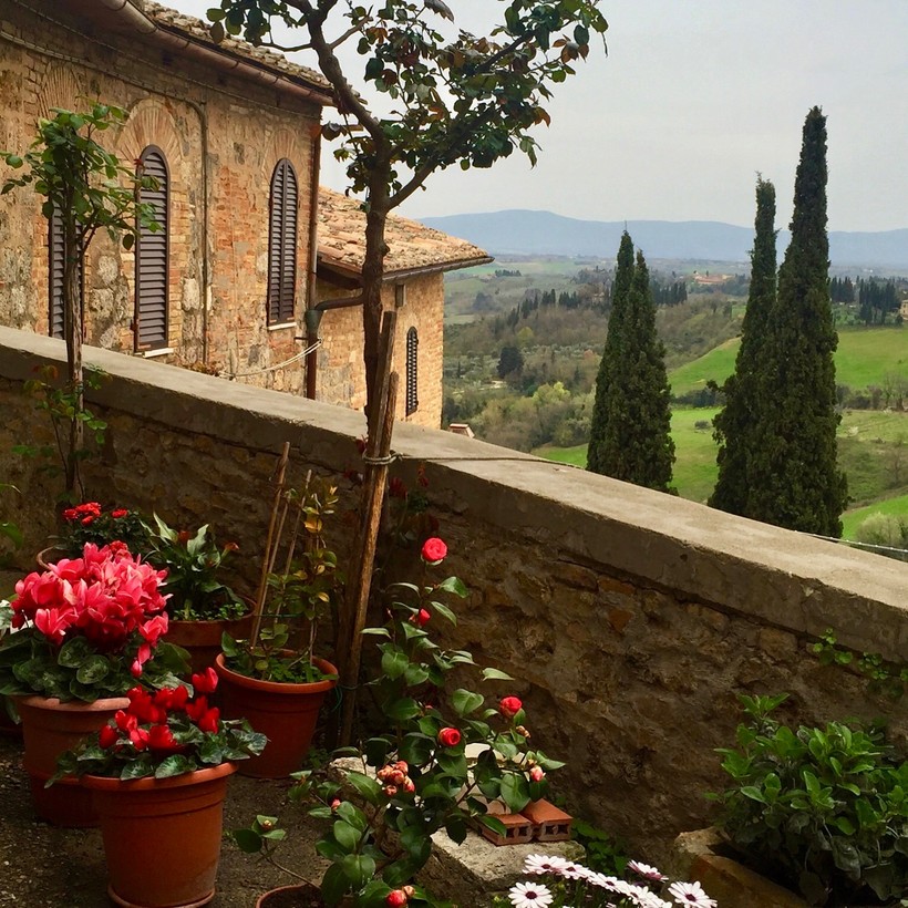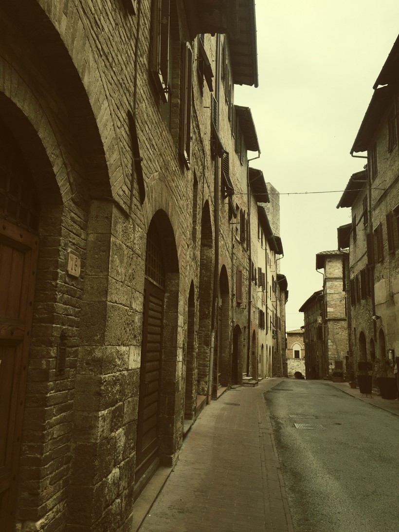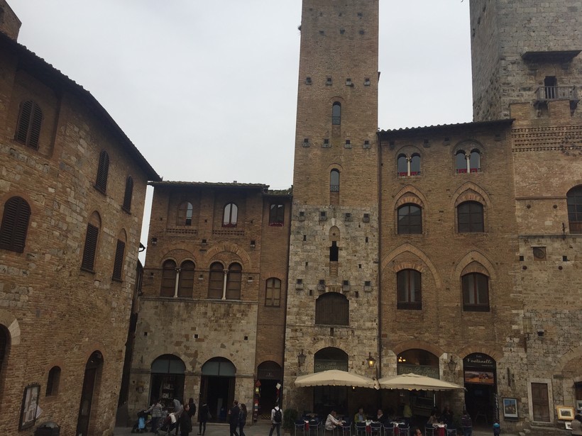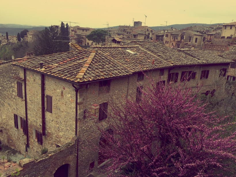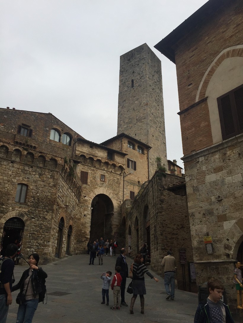 Мы жили на ферме у милых итальянцев, занимающихся сельским хозяйством возле города Импрунетта. В Сан-Джиминьяно отправились на автомобиле, чтобы погулять один день. Этого вполне достаточно для общего осмотра городка, построенного на возвышении на месте этрусского поселений. В сущности он представляет собой средневековое укрепление с жилыми домами, узкими улочками, площадями, палаццо и храмами, а также 14 высокими башнями, которые стали его визитной карточкой. Дело было во второй половине марта, стояла самая комфортная для прогулок погода, около 18 градусов, небо затянуто легкими облаками, полное отсутствие ветра.