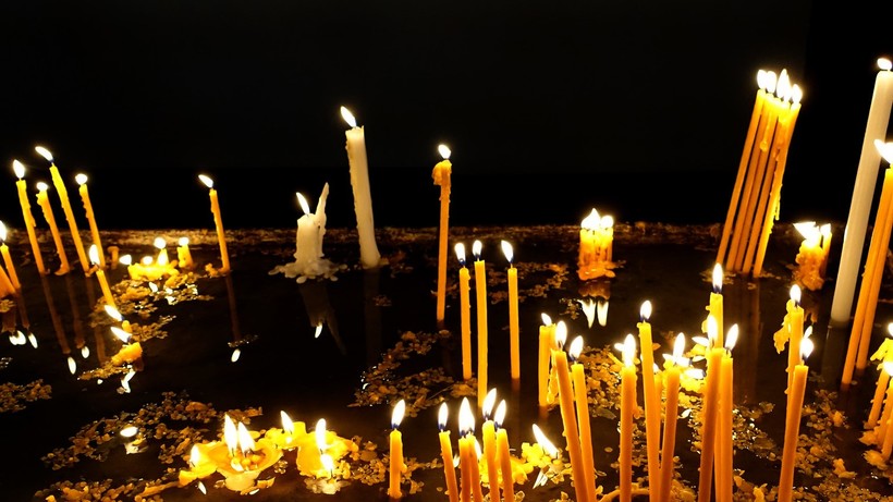 Зажженные свечи здесь ставят в специальный поддон с водой, что для нас очень необычно.