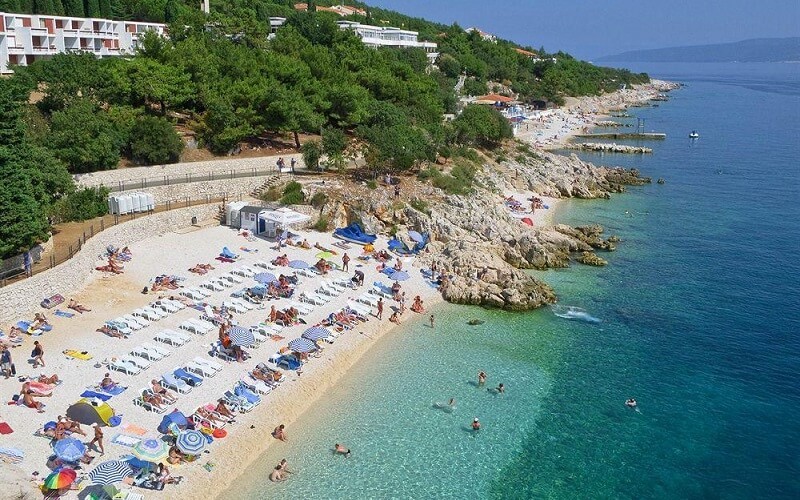 - Большой общественный общий пляж. Для тех, кто не хочет заморачиваться в Хорватии на отпуске с поездками на разные пляжи – самое то. А ведь на большинстве курортов надо ехать куда-то на пляж, да и не всегда автобус есть, и где его искать, маршрут какой и т.п. Проблемы возникают часто. Здесь пляж в центре, большой, его вполне должно хватить для стандартного отдыха.