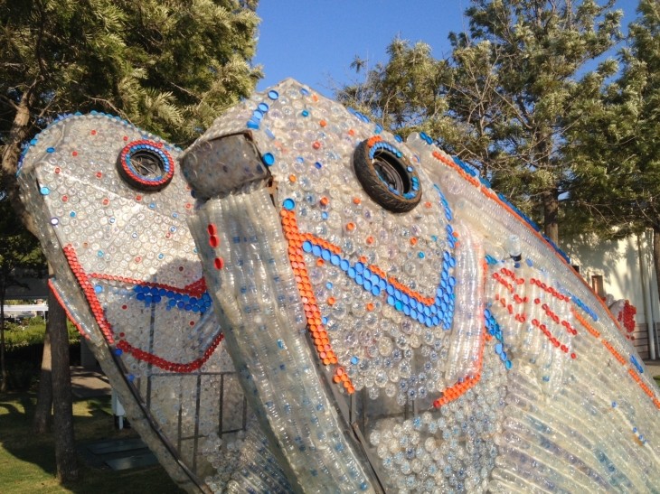 - Справа от всех магазинов пара аллей с инсталляциями из отходов цивилизации - пластиковых и стеклянных бутылок, коробок, покрышек, металлолома. Их задача - привлечь внимание к загрязнению моря ведущему к гибели его обитателей. При взгляде на это невольно задумываешься, сколько же мусора на нашей планете...