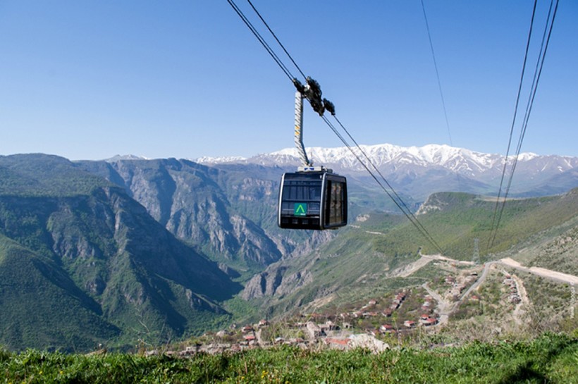 - Крылья Татева. Это самая длинная канатная дорога в мире. Длина дороги 5752 м., длительность 12 минут, высота в самой высокой точке 320 метров. Кабина закрытого типа, вместимостью од 25 человек. При полете гид не понадобится, так как там будет аудио-экскурсия, на русском и на армянском языках (возможно есть еще английский). По дороге вам открывается невероятный путь до Татевского монастыря. Пока вы ожидаете свою экскурсию, можно купить сувениры или посидеть в ресторане Татеватун, с безумно прекрасным видом на горы.
