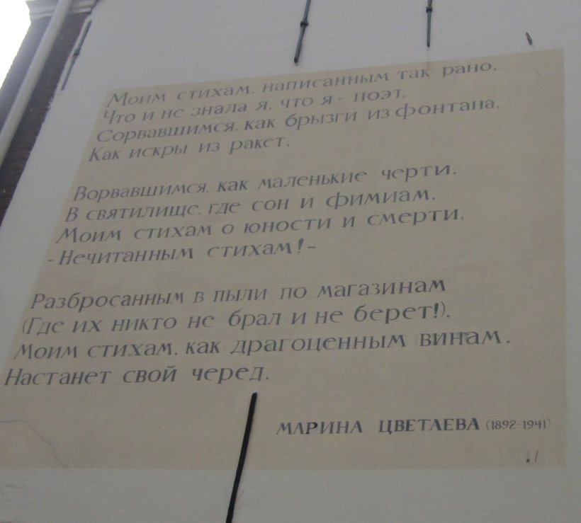 Как выяснилось, Цветаева не одинока. К ней в компанию шел и Блок с его «Ночь, улица, фонарь, аптека», и Ахматова с «Музой», и где-то еще были Хлебников и Мандельштам, которых я пропустила. А вообще в Лейдене на стенах написано 101 стихотворение на разных языках. Этому проекту уже много лет, и так приятно сознавать, что стихи Цветаевой появились самыми первыми!