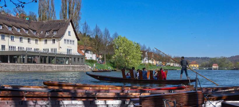 - Через Тюбинген течет красивая река Неккар, в которую впадает несколько мелких рек. И тут самое интересное – если вы хоть раз видели фильмы про жизнь студентов Кембриджа или Оксфорда, то знаете, что там часто проходят соревнования по гребле на длинных лодках. Так вот в Тюбингене тоже есть нечто подобное. И на таких лодках в теплое время года могут кататься все желающие туристы.