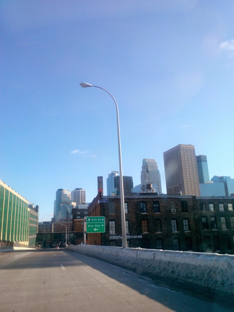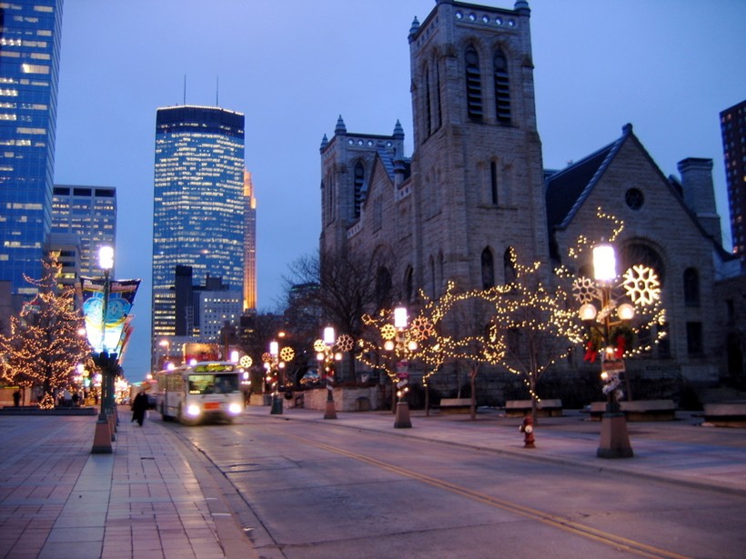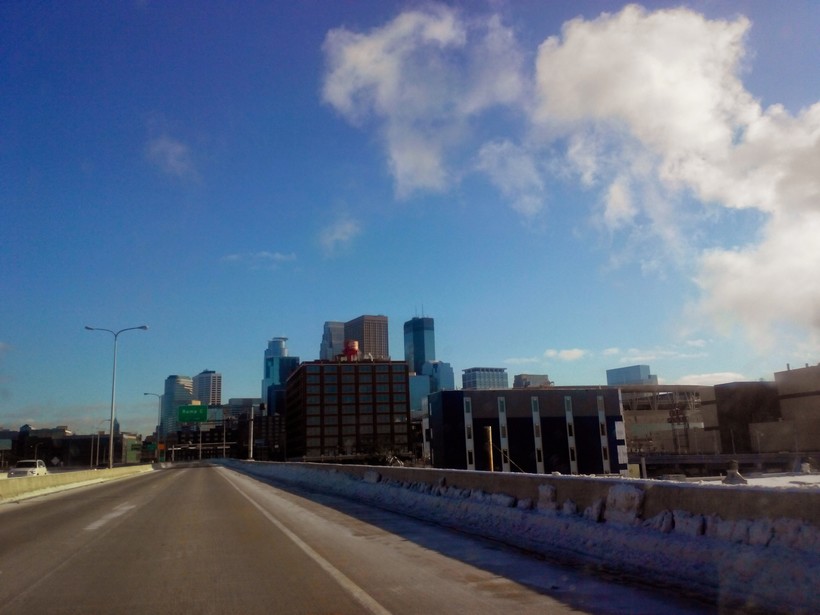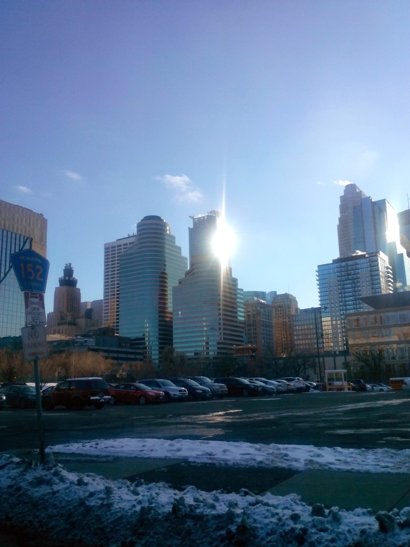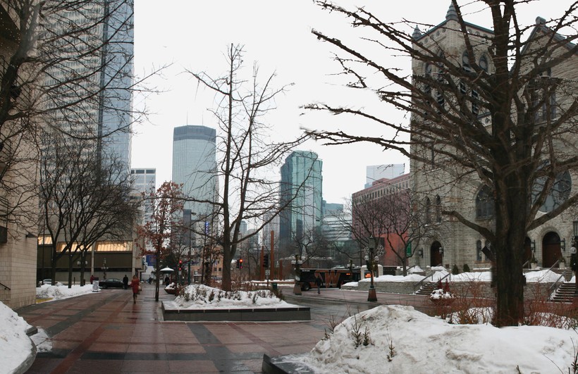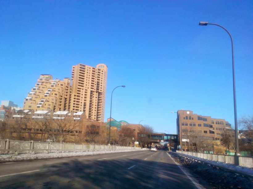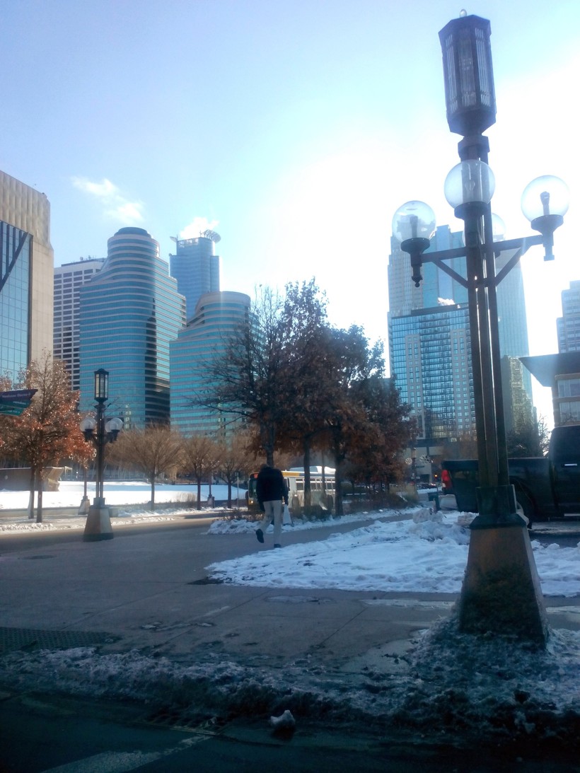 Миннеаполис прекрасный город, крупный мегаполис, но поздней осенью очень уж холодно в нем. Мы доехали до него уже, когда снег плотно покрыл улицы, а температура воздуха опустилась до минус 15. Центральная часть города - Даунтаун, предстала передо мной в виде сияющего от солнца и снега большого стеклянного куба, так как нас буквально окружили высотки, отделанные стеклом.
