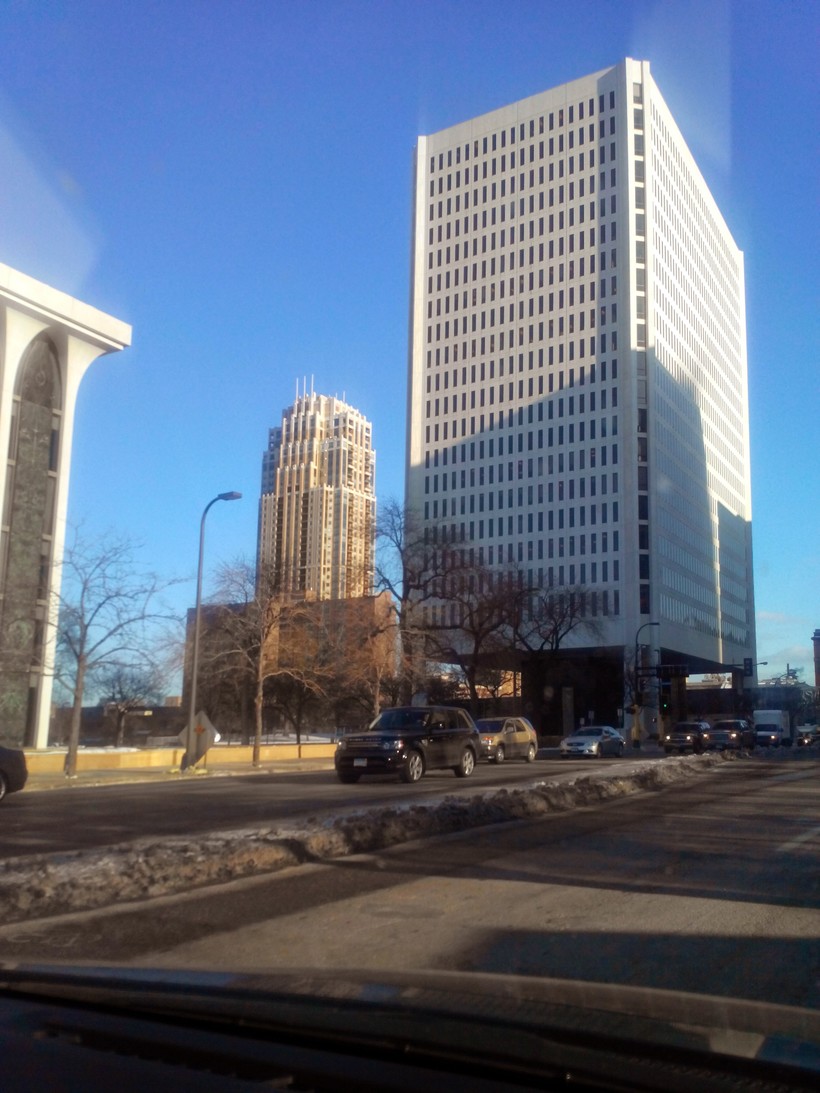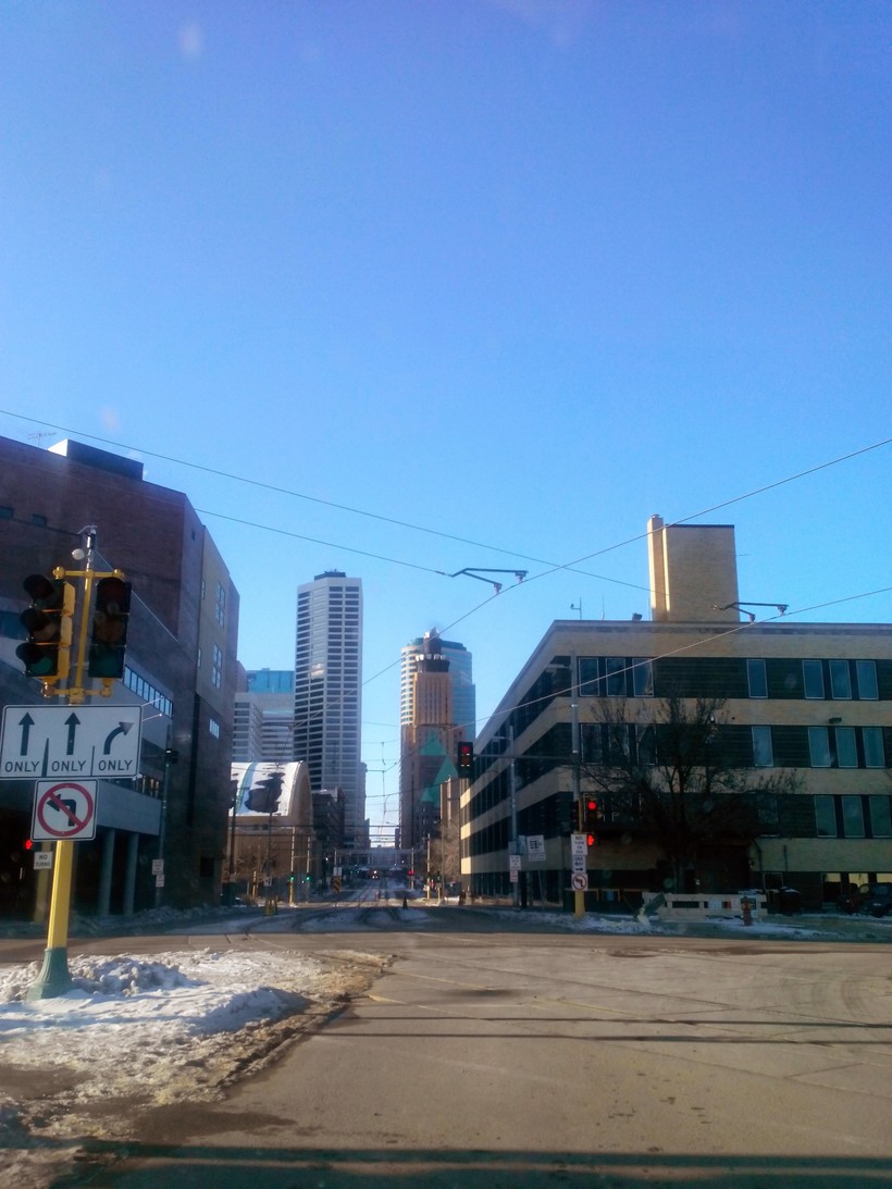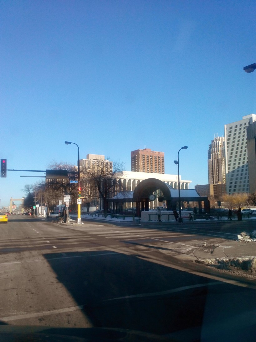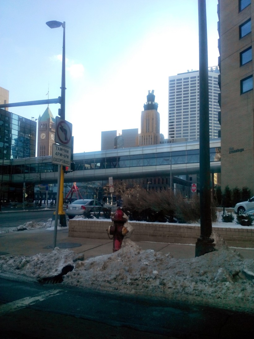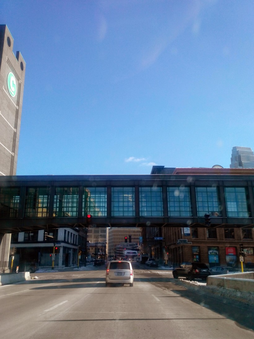 Миннеаполис прекрасный город, крупный мегаполис, но поздней осенью очень уж холодно в нем. Мы доехали до него уже, когда снег плотно покрыл улицы, а температура воздуха опустилась до минус 15. Центральная часть города - Даунтаун, предстала передо мной в виде сияющего от солнца и снега большого стеклянного куба, так как нас буквально окружили высотки, отделанные стеклом.
