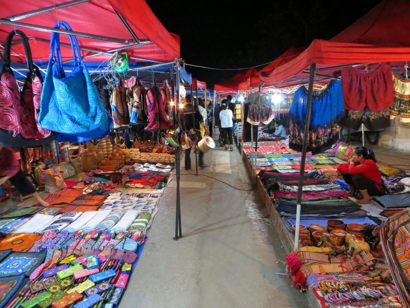 С наступлением темноты я обычно шел на вечерний рынок: его устраивают ежедневно, ради чего перегораживают улицу Sisavangvong как раз в том месте, где делают сэндвичи. На рынке продают всякие поделки, сувениры, украшения, недорогую одежду и обувь и т.д. Всё это декорировано нарочито аутентично, чтобы даже идиот понял, что вещь из Лаоса. Я не сравнивал цены с сувенирными лавками, но, с точки зрения удобства, рынок, по-моему, выигрывает у магазинов: всё можно купить в одном месте, причем, когда уже не жарко.