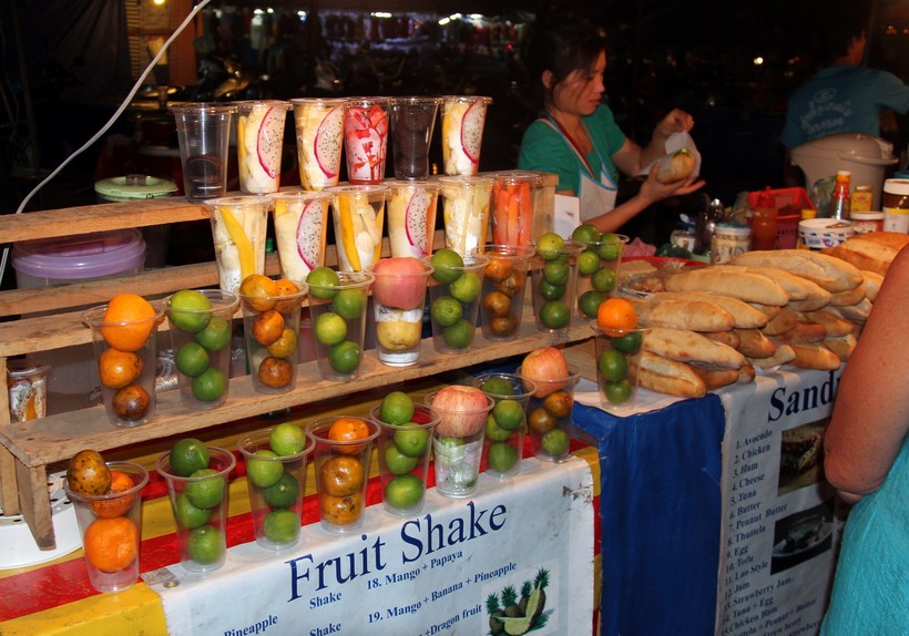 Lao Style Sandwich – это свежеиспеченная хрустящая булка (спасибо французам-колонизаторам за культурное влияние) и 50 вариантов начинки: от заурядных вроде курица + листья салата + помидоры, до очень смелых типа тунец + сыр + авокадо. Булка здоровенная, почти батон, так что одного сэндвича мне было вполне достаточно, чтобы сытно пообедать. Запивать еду предлагалось фруктовым шейком. Тут всё более традиционно: банан + клубника, манго + ананас и еще три десятка сочетаний на выбор. Особенно мне понравился банан + Nescafe 3 в 1 и яблоко + лайм + сушеная мята.