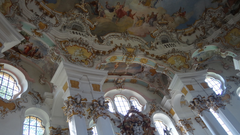 Внешне церковь выглядит хотя и большой, но весьма аскетичной. Но тем сильнее контраст между ее экстерьером и тем, что мы увидели внутри. Пожалуй, если какое-то культовое сооружение и может потягаться с вильнюсским собором Петра и Павла в плане интерьера, то как раз церковь в Висе. Возможно, скульптурных элементов там поменьше, зато в немецкой церкви богатая лепнина сочетается с яркими фресками.