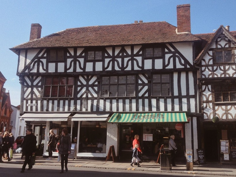 Дом стоит на пешеходной улице Хенли-стрит, и все дома здесь старые и выполнены в той же технике. В Англии распространены белые дома с контрастными черными раскладками.