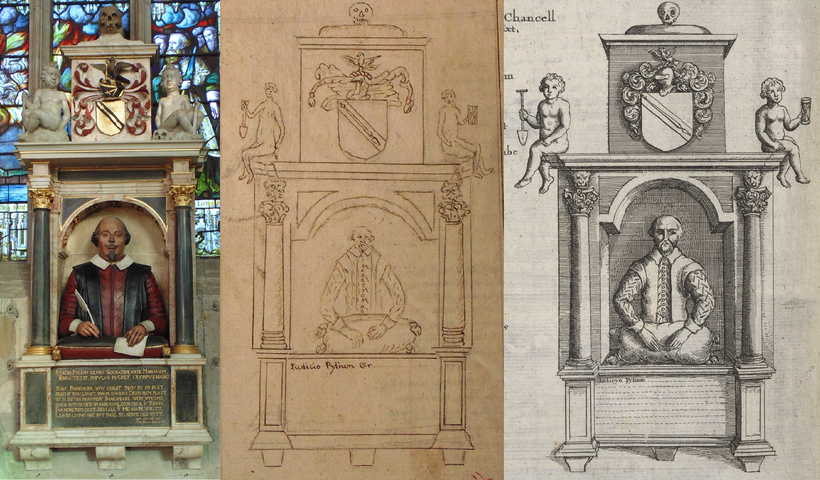 Если ваш гид верит в мифического Шекспира (продолжая называть его по-английски Шейкспиром), он непременно заведёт вас в церковь Св. Троицы, где в стене покажет знаменитый раскрашенный бюст странного товарища с осоловелым взглядом и вооружённого пером и бумагой. Как это часто бывает с памятниками, сегодняшний бюст – это не совсем тот, который здесь был установлен в 1623 году (хотя гид скажет, что тот самый). Потому что есть рисунки современника, путешествовавшего по Уорикширу и делавшего в дневнике подробные записи, к счастью, сохранившиеся. На его эскизах бюст изображён со слегка другой головой, а вместо бумаги и пера он держит в руках… мешок, не то с зерном, не то с деньгами.