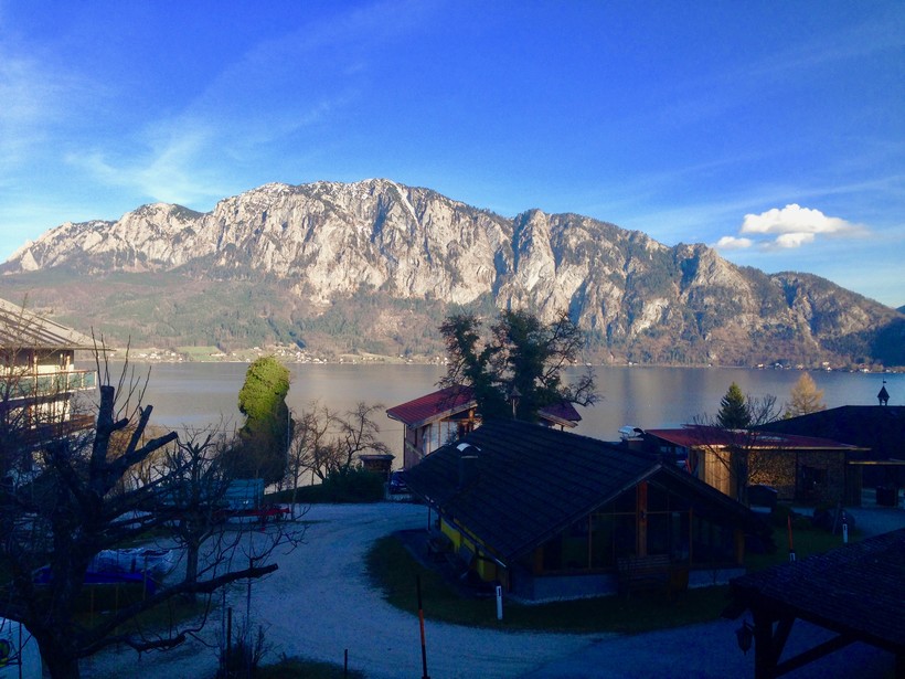 По побережью всего озера, там, где горы не подступают вплотную к воде, расположилось множество маленьких курортных городков. Мы ткнули пальцем в тот, который назывался так же, как и само озеро -Аттерзее или Аттерзее-ам-Аттерзее и не прогадали - место очаровательное. На сайте booking.com мы забронировали комнату в пансионе у милой семьи Шмидт. Местные жители в большинстве своем сдают специально оборудованные комнаты приезжающим туристам. К нашим услугам был уютный двухместный номер с полностью оборудованным кухонным уголком. Утром, по нашей просьбе, хозяйка приносила свежеиспеченный хлеб, можно было приобрести домашний сидр, а также попросить подготовить сауну. Из окна открывался фантастический вид.