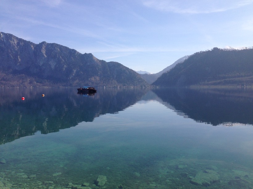 Надышавшись на вечерней прогулке чистейшим горным воздухом, мы отлично выспались в полной тишине и утром отправились пешком обследовать окрестности. В Аттерзее вдоль озера существует симпатичный променад, где можно присесть в кафе, чтобы выпить чашечку кофе или перекусить. Вода в озере абсолютно прозрачная, и в ней отражаются горные хребты.