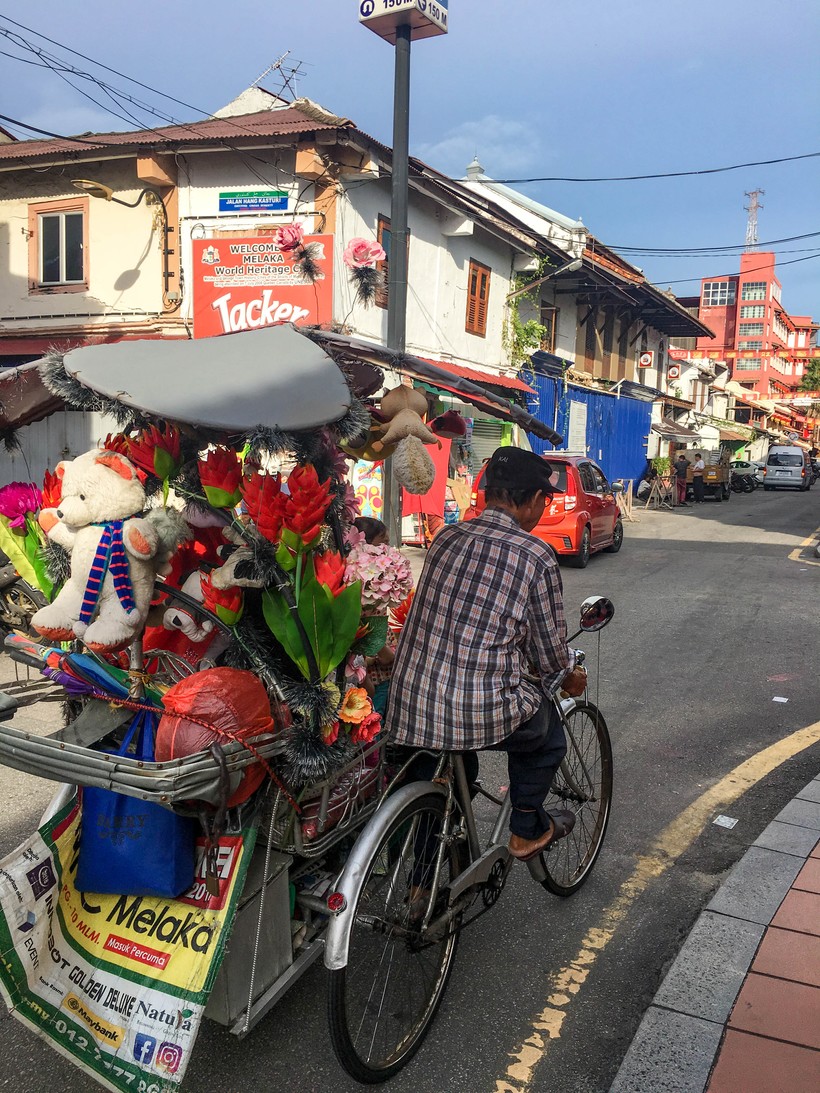 Местные велорикши тоже сложно оставить без внимания. Они не только пестрят украшениями и мишурой, но и издают до неприличия громкие гудения. Иногда из их динамиков доносятся звуки малайзийского шансона. Зрелище еще то.