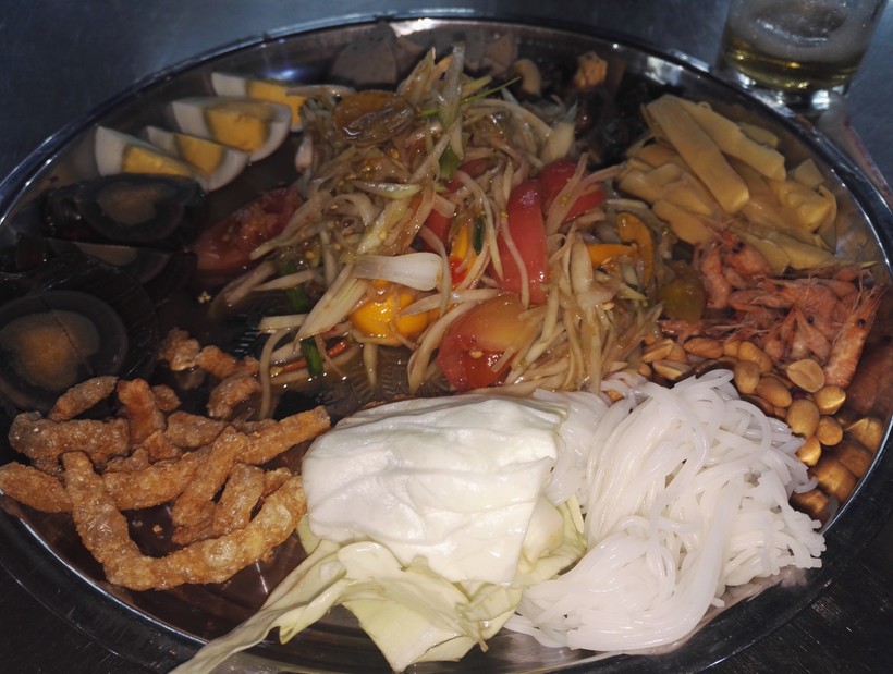 Первое, что мы сделали, разобравшись с жильем, — отправились кушать. Во Вьентьяне очень много фудкортов, где можно отведать сразу и много местной еды. Первый наш заказ показался и последним: слишком остро. Почти вся местная еда очень острая. Мне показалось, что даже острее тайской. Цены, конечно же, доступные, как и в других ближайших странах ЮВА.