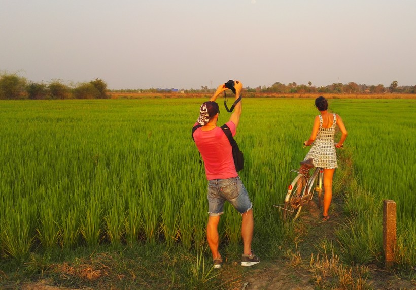 На велосипедах мы объездили окраины Вьентьяна и повидали простую деревенскую жизнь. Как один из вариантов для поездки – рисовые поля. Мы устроили там небольшую фотосессию после чего отправились дальше.