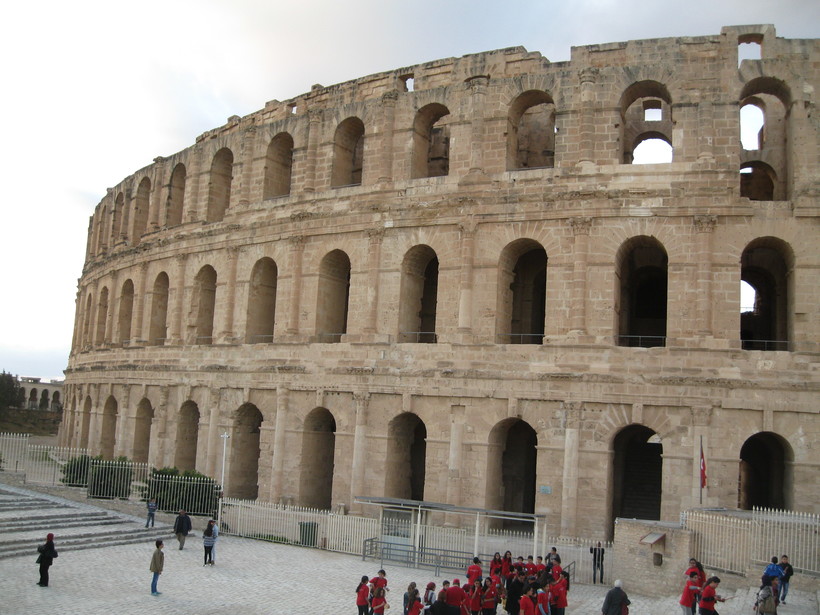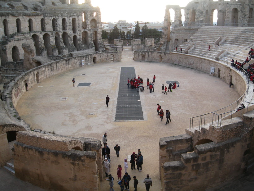 - Амфитеатр Эль-Джем. Это главная достопримечательность города, ради которой сюда и стоит ехать. Величественное здание, заметное еще издалека. Он очень хорошо сохранился - вплоть до фресок внутри, хотя многие камни оттуда и использовались для строительства самого города Эль-Джем и мечети Укба в городе Кайруан. Там просто великолепная акустика к тому же! В общем, это что-то невероятное бродить там среди самой истории, воплощенной в камне.