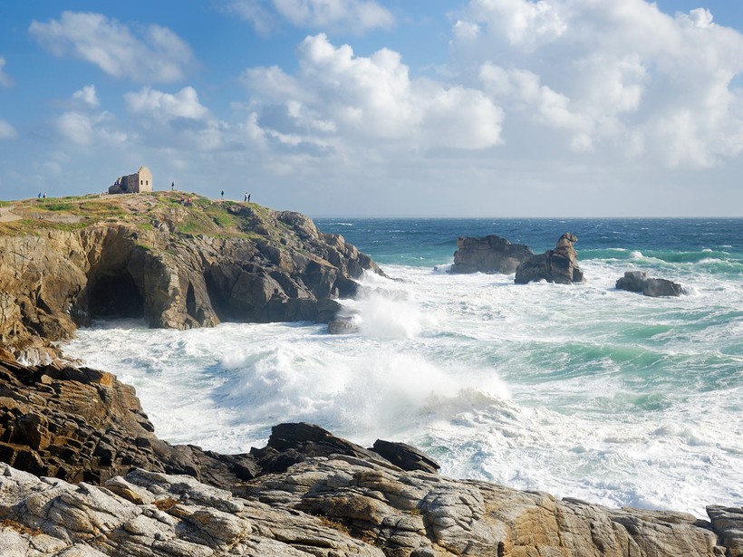 А дальше мы поехали к курортному городу Киброн, и вот там уже пейзаж немного поменялся. Местность стала более холмистой, даже, я бы сказала, скалистой. Мы как-то удачно свернули и выехали на совсем другой берег – с высокими берегами, прибоем на темных камнях и более «бретонского» вида. Ну, слава богу, телепорт в Юрмалу не открылся, мы по-прежнему во Франции.