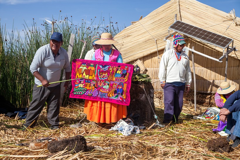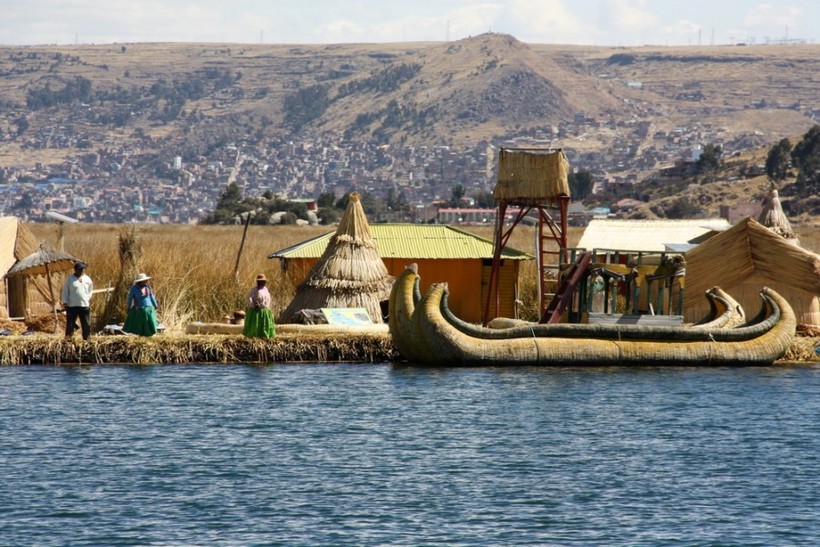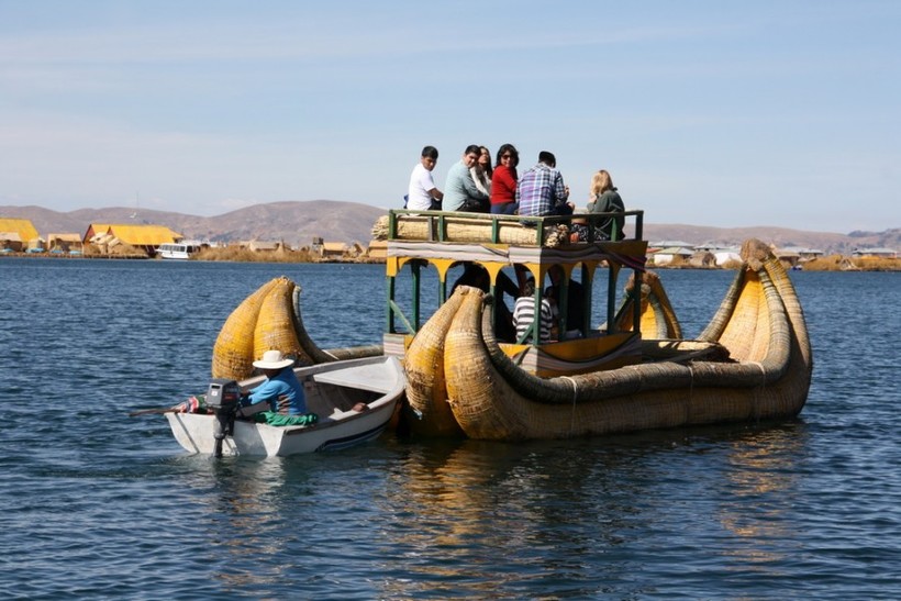 Через полчаса наша лодка подплывает к цепи островов. На пристани нас встречает, как он сам выражается, президент острова. Из под национальной рубахи «президента» просвечивает футбольная майка с номером 13. Он показывает на пришвартованный традиционный корабль из тростника и около 15 минут рассказывает о достоинствах этого «мерседеса озера Титикака», а также предлагает прокатиться всем желающим всего-то за 10 долларов с человека.