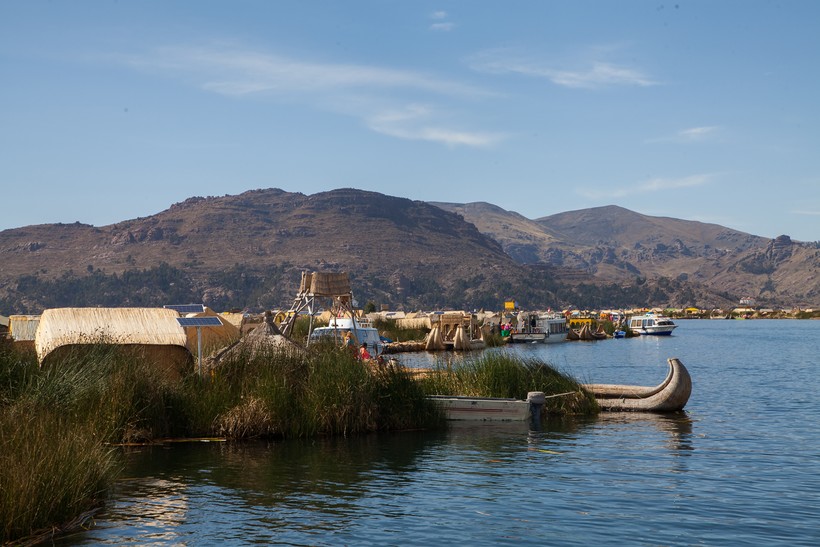 Город находится в заливе, который сильно порос тростником. Чтобы хоть немножко посмотреть на озеро, я решила прокатиться до соседних «плавучих» островов – Урос. Меня предупреждали, что эти острова давно превратились в цирк для туристов, но любопытство взяло вверх – на пристани я сажусь в моторную лодку и плыву по Титикаке.