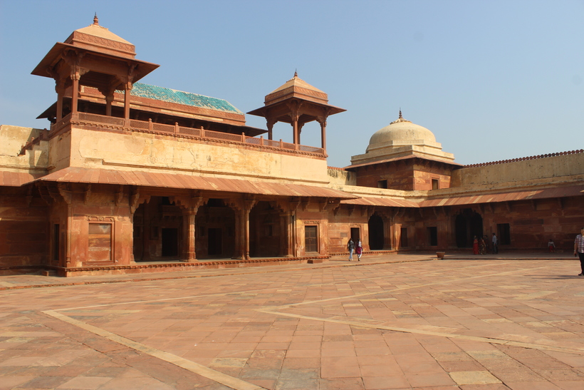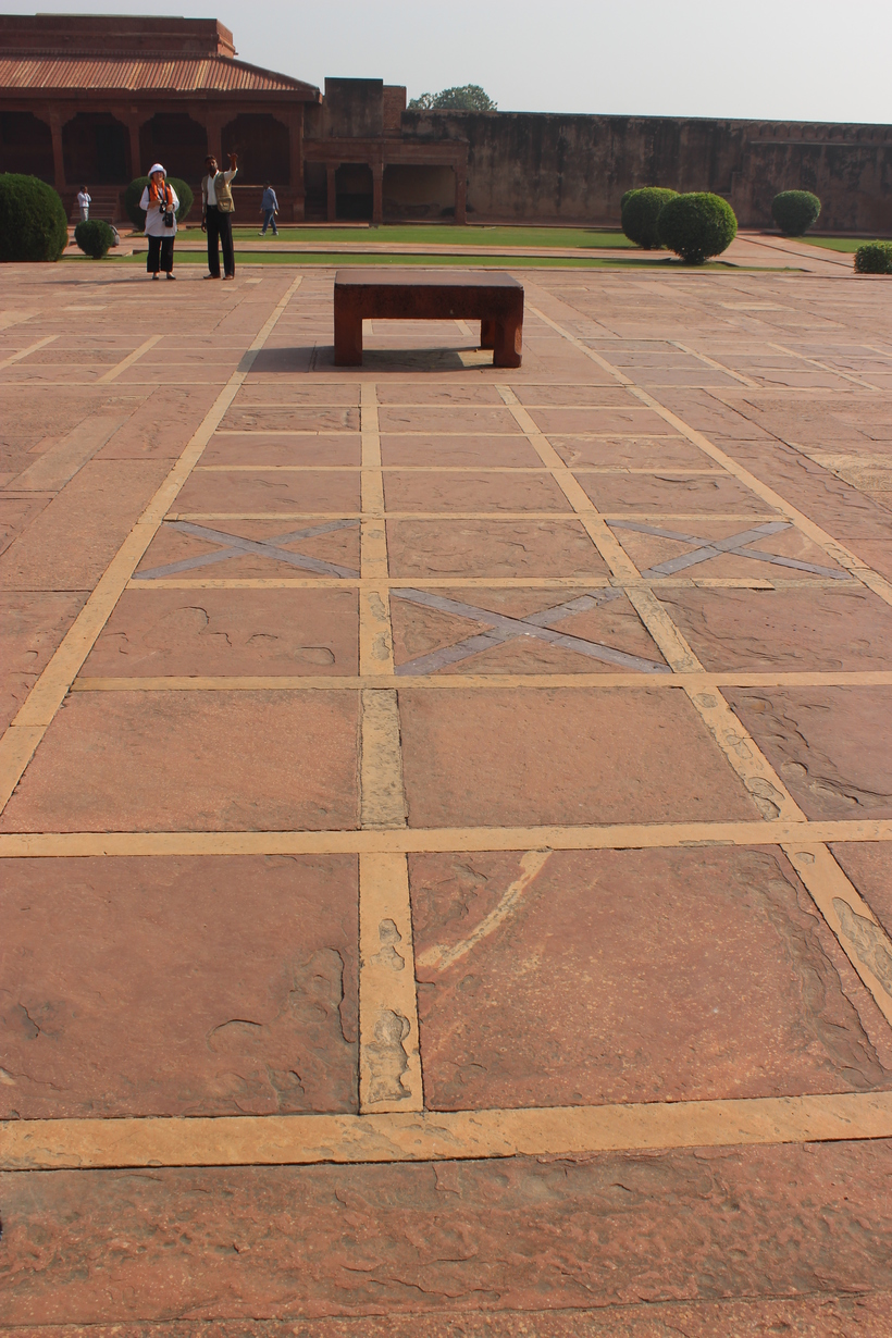 Выйдя на улицу, не спешите перемещаться в сакральную зону города, ведь прям посередине площади недалеко от бассейна можно обнаружить странные клетки на полу. Это старинная игра в кости - Пачиси, фигурами которой являлись настоящие девушки-наложницы. Недалеко имелось помещение, в котором все наложницы проходили обучение грамоте, письму, счету и так далее. Своеобразная школа для гаремных жительниц.