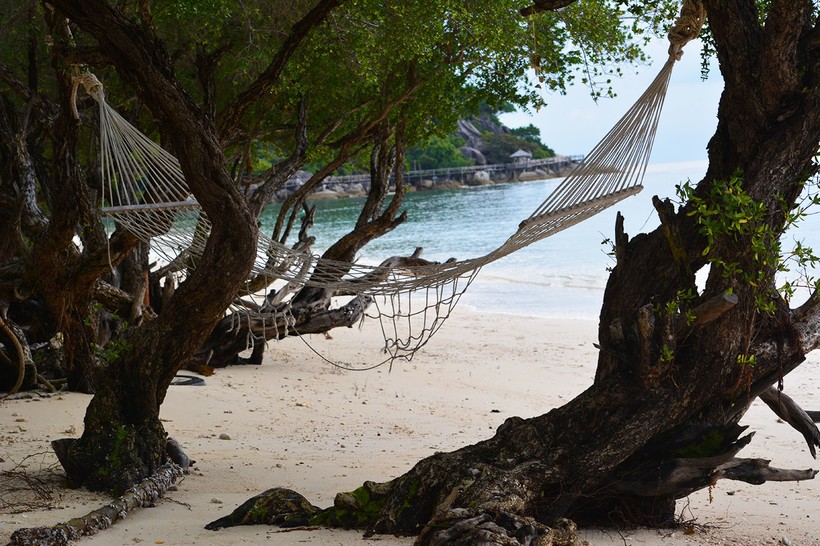 Этот пляж – мой любимец. Всего 10 минут пешочком с Хаад-Рин-Нок и вы на месте. Этот живописный пляж усеян пальмами и маленькими деревцами, стволы которых погружены прямо в кромку воду. Здесь повсюду бесплатные гамаки и качели.
