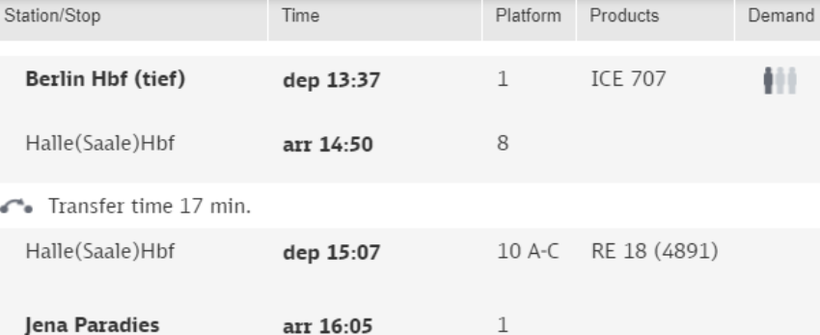 Пересадка в Галле по времени обычно не больше 17 мин., и хотя поезда в Германии не самые пунктуальные, пусть вас это не пугает. Покупать билет вы будете общий на весь маршрут Берлин — Галле — Йена, и, в случае задержки первого поезда, в Галле вас посадят на следующий ближайший до Йены.