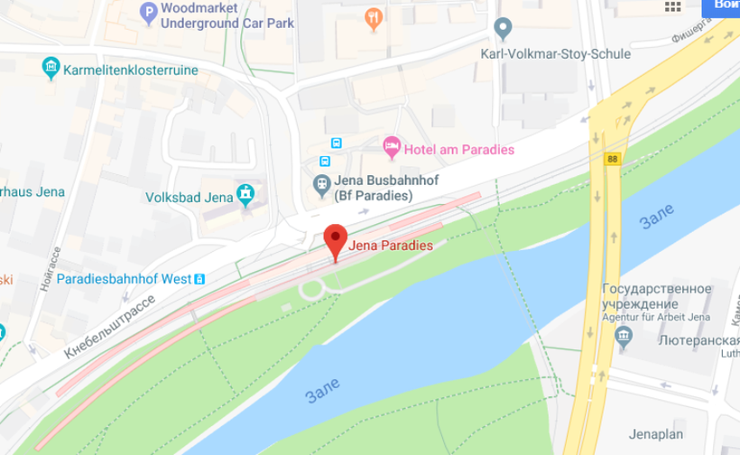 Отправляются поезда из Берлина с центрального ж/д на Europaplatz 1, а прибывают в Йену на вокзал Jena Paradies на Кнебельштрассе.
