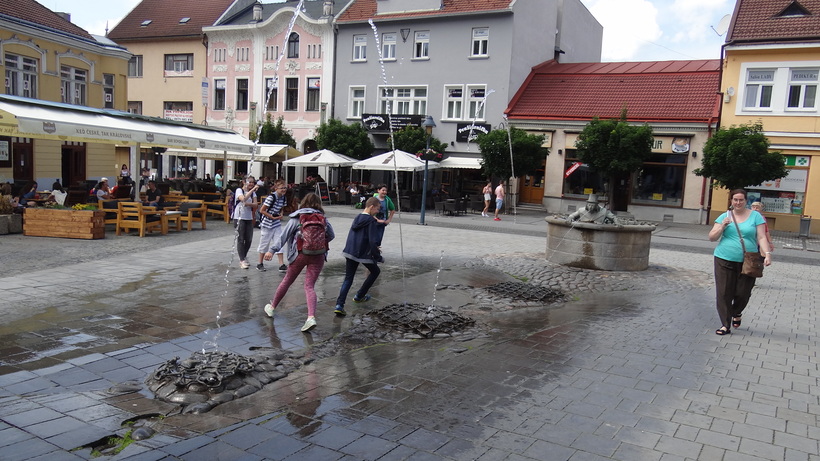 - Исторический центр. Он находится непосредственно у подножия замковой горы. И да, меня не особенно впечатлил столь рекламируемый во многих путеводителях Дом Палача, а также довольно топорная на вид церковь в стиле барокко, зато здание синагоги я на протяжении нескольких дней считал самым красивым подобным сооружением из всех, что я видел (потом я приехал в Будапешт, и тренчинская синагога откатилась на второе место). Кроме того, в старом Тренчине есть очень занятный фонтан. Он представляет собой фигуру вылезающего из колодца водяного, которая плюет струями воды в одну из трех решеток. Потом как будто эта же струя «выныривает» из первой решетки во вторую, а затем из второй в третью. В общем, это надо видеть, и вполне реально залипнуть у этого фонтана на несколько минут, особенно если у вас фотоаппарат. Есть еще здание отеля Elizabeth — многих оно привлекает возможностью увидеть оттуда надписи, оставленные еще римлянами на замковой горе, к которой и примыкает гостиница, но я заходить внутрь не стал, зато снаружи здание, построенное в стиле модерн, выглядит очень эффектно.