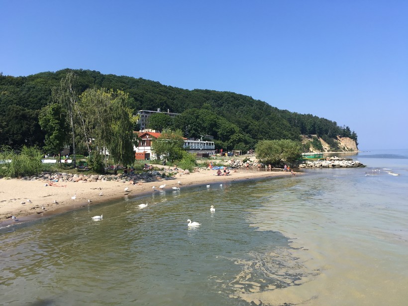 Здесь тоже есть пирс с кружащими над ним чайками, лебеди на берегу, кафе около пляжа, но все намного спокойнее и уютнее, чем в соседнем Сопоте. Туристов здесь гораздо меньше. Отдых, пожалуй, подойдет для более взрослой публике, ищущей не шумные тусовки, а спокойные прогулки и уединение.