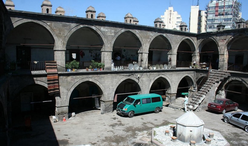 Утром следующего дня мы запланировали посещение некоторых достопримечательностей, которые нас интересовали, и потом решено было отправиться пешком до автовокзала - посмотреть современный город. После осмотра центральной площади и медресе, мы решили посетить караван-сарай и не смогли найти вход. Он спрятан между мечетью Хунат Хатун и рынком Бедестен, но всё пространство выглядело одной сплошной стеной из лавок и магазинчиков и не было никакого намёка на нужный нам проход. Мы походили туда-сюда и ничего не нашли. У нас, видимо, были настолько растерянные и озадаченные лица, что какой-то мужчина сначала мимо нас прошёл, а потом развернулся и спросил что мы ищем. Выяснилось, что он не только прекрасно знает где находится нужный нам вход (без проводника мы бы точно ничего не нашли), но и знает историю этого места. Он провёл нам небольшую экскурсию.