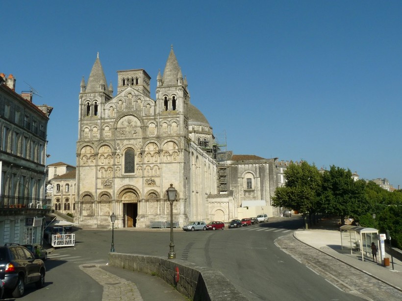 Ангулем предстал передо мною вечерним. Поставив машину, забросив чемоданы в номер и накинув кофточки, мы пошли гулять. Конечно, из-за того, что было уже довольно поздно, ни в какие исторические объекты внутрь мы не попали, как и в музеи. Ангулемский собор был закрыт, однако, это не помешало полюбоваться его фасадом. Фасад просто отличный! Не знаю, чем он меня так впечатлил – может, тем, что реально похож на гравюру из старинной книги. Вот как будто книгу перед тобой развернули, вынули нарисованный собор, он внезапно сделался 3D и стоит перед тобой. И конические башни у него такие забавные и необычные. Редкий собор романского стиля, так зацепивший меня внешне.