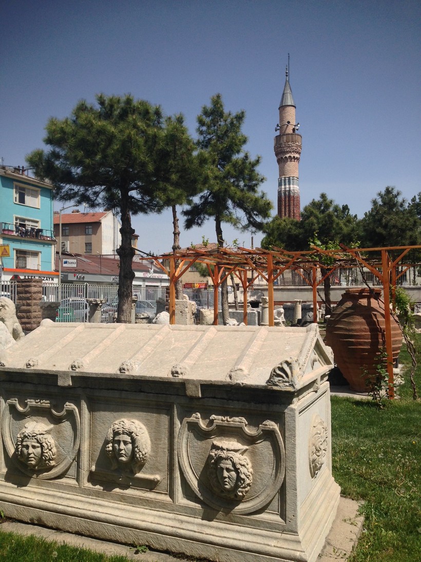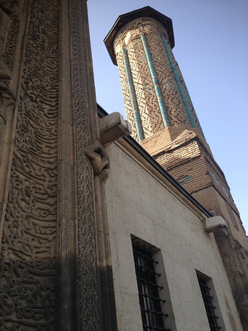 Одной из самых популярных мечетей, включающей медресе и возведенной еще во времена сельджуков (1254 год), сейчас предстает перед посетителем в виде музея камней. Его можно узнать по расписному короткому минарету. Внутри я нашла крутую коллекцию деревянных дверей также 13 века! Останки от древнего сельджукского дворца, причем некоторые из них мне напомнили наш российский герб.
