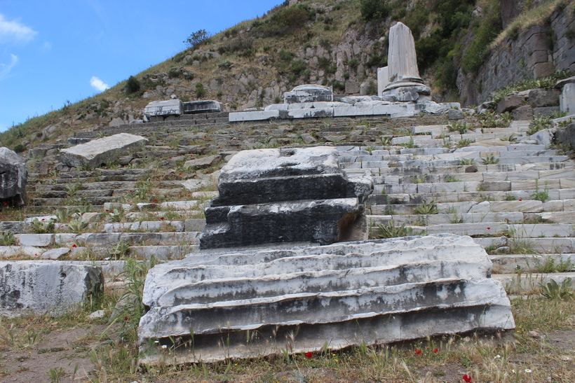 - Рядом справа находился храм Диониса, того самого Бога вина и развлечений, но я обнаружила только мраморный постамент и пенек в виде остатка от колонны.