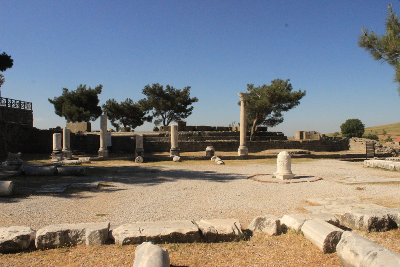 - Рядом находилась библиотека (к сожалению сейчас там тоже стоят только колонны). Но ранее в ней располагалась богатейшая коллекция древних собраний и писаний. Зайдите на ее территорию и представьте, что когда-то среди книжных полок возвышалась почти четырехметровая статуя Афины, а вокруг нее был организован читальный зал. Собственно благодаря библиотеке и был придуман пергамент. Исторические данные говорят, что египетский фараон запретил экспортировать папирус на территорию древней Анатолии, так как завидовал такому количеству книг. Ну а местный художник, используя кожу козла, создал свое средство для нанесения летописи.