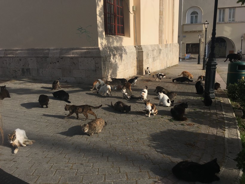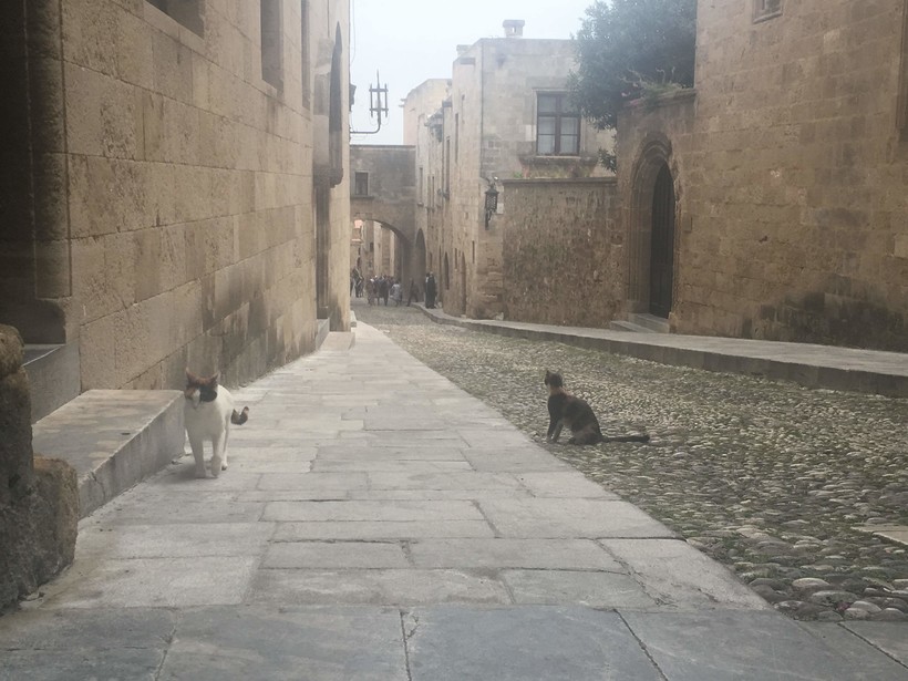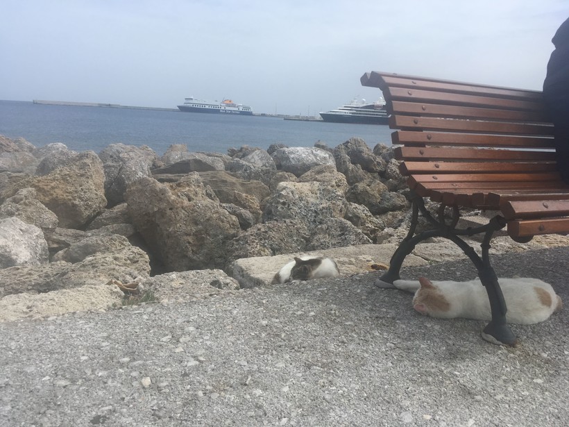 На утро мы отправились смотреть город. Старый город, конечно, очень красив, улочки узкие, много ресторанов, магазины (порой кажется, что ты идёшь по рынку). Красивая набережная, большая Марина. Но тут я хочу отметить другой примечательный момент - котики. Если пройти от Родосской крепости мимо мельниц в сторону форда Святого Николоса, можно увидеть домик для кошек и их хранителя (вероятно, это человек без определённого места жительства). Кошек здесь действительно очень много, им специально приносят еду и они очень классные, особенно когда сидят на камушках и беззаботно смотрят на море.