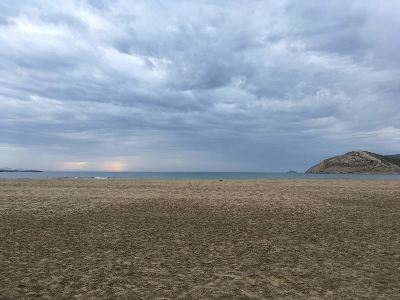 Одно из самых запоминающихся мест - Просаниси, поцелуй морей, место где встречаются Средиземное море и Эгейское море. Здесь очень широкий пляж, наверно ширина его около километра.