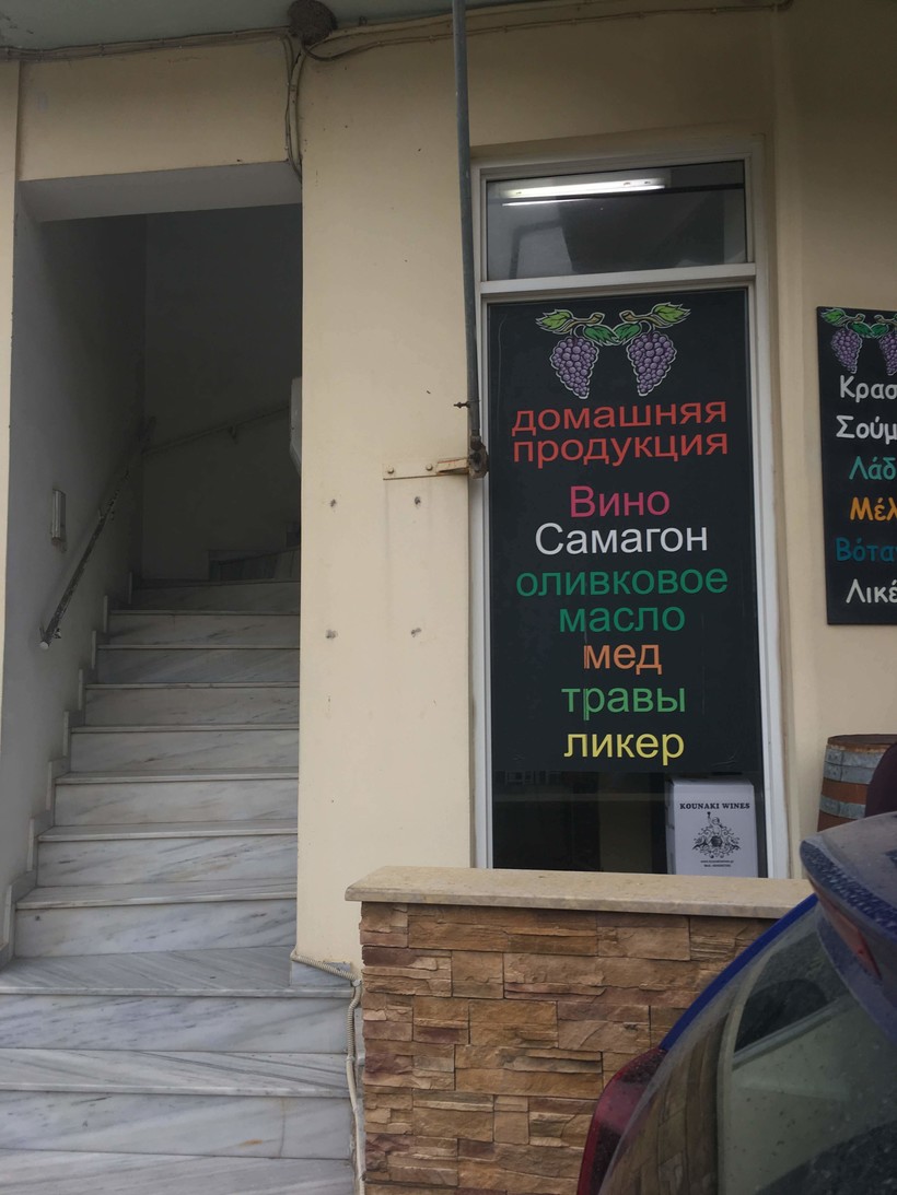 В один из дней мы отправились в тур по винодельням, точнее по деревням, которые славятся продажей вина. Мы арендовали машину на 2 дня (трезвый водитель у нас был), и передвигались между деревнями на ней, хотя можно было найти прям винный тур с русскоговорящим гидом, но это обошлось бы во много раз дороже. В каждой из деревень мы заходили в винные магазины, где проводят дегустации и всячески заманивают туристов. На одном из магазинов даже была надпись на русском "СамАгон". Вообще, к слову, на Родосе живет очень много русских, много вывесок на русском (везде на трассах можно увидеть слово "Меха").