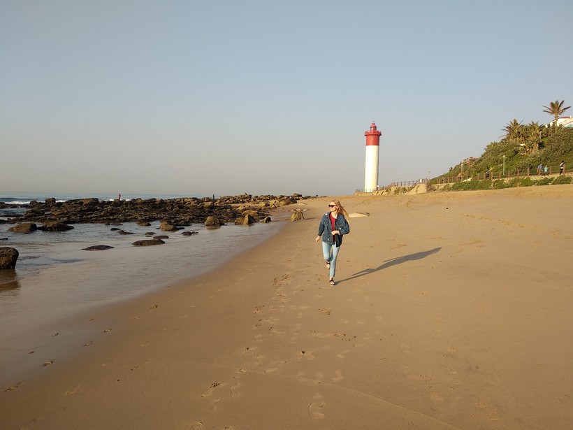 Смелые парни сёрфили в волнах, на берегу резвились сотнями маленькие детишки, а кругом чинно и не очень прохаживались туристы! К тому же Дурбан - это огромный портовый узел, а там где порт - там практически всегда грязное море, которое совершенно не располагает к к купанию. Мне такое было не по душе, и прогулявшись по довольно симпатичному променаду Золотая миля, который является визитной карточкой города, я уехала в менее людное место - Умхланга. Этот курорт посоветовала местная жительница с бурскими корнями, как свой любимый на побережье. Приехав туда, я поняла почему – берег украшает огромный действующий маяк, песчаные пляжи перемежаются с каменными заходами, и всё кругом дышит умиротворением.