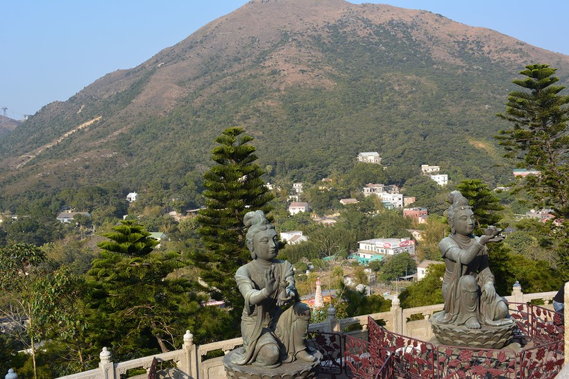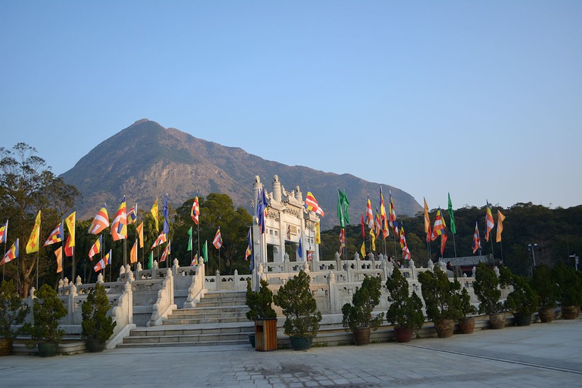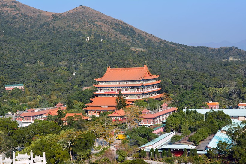 Внизу находится небольшой действующий буддистский храм «Po Lin». Рядом с храмом можно попробовать блюда монастырской кухни, а также купить сувениры.