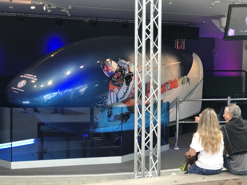А вот что по-настоящему захватило, так это тренажер-имитатор. Он имитирует прыжки! И еще слаломный спуск. Мы попробовали. Ой, мамочка. Вот и хорошо, что я не стала этим спортом заниматься. У меня всегда вопрос, когда я соревнования смотрю: как, как они не боятся так прыгать? Это же ужас что такое. Как они шею не ломают?